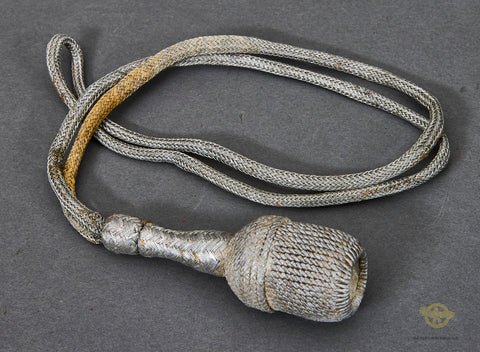 German WWII 2ndModel Luftwaffe Officer's Portapee-This is a well-worn example of a silver bullion officer's dagger knot. This shows some finish loss to the silver bullion acorn and discoloration to the cord. It does not show fraying, but please see the photos.
