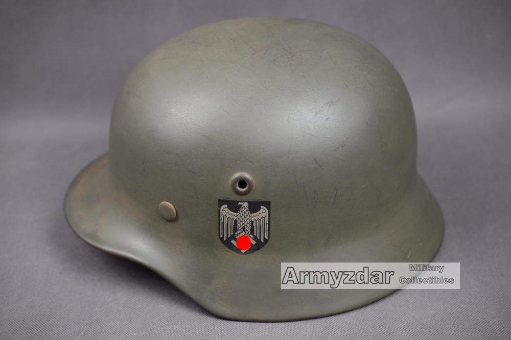 This is a high quality reproduction of WW2 WH M40 double decal helmet. The helmet shell is original war production, but paint and liner are new. The helmet was perfectly aged to looks like original.Size: Q64/57