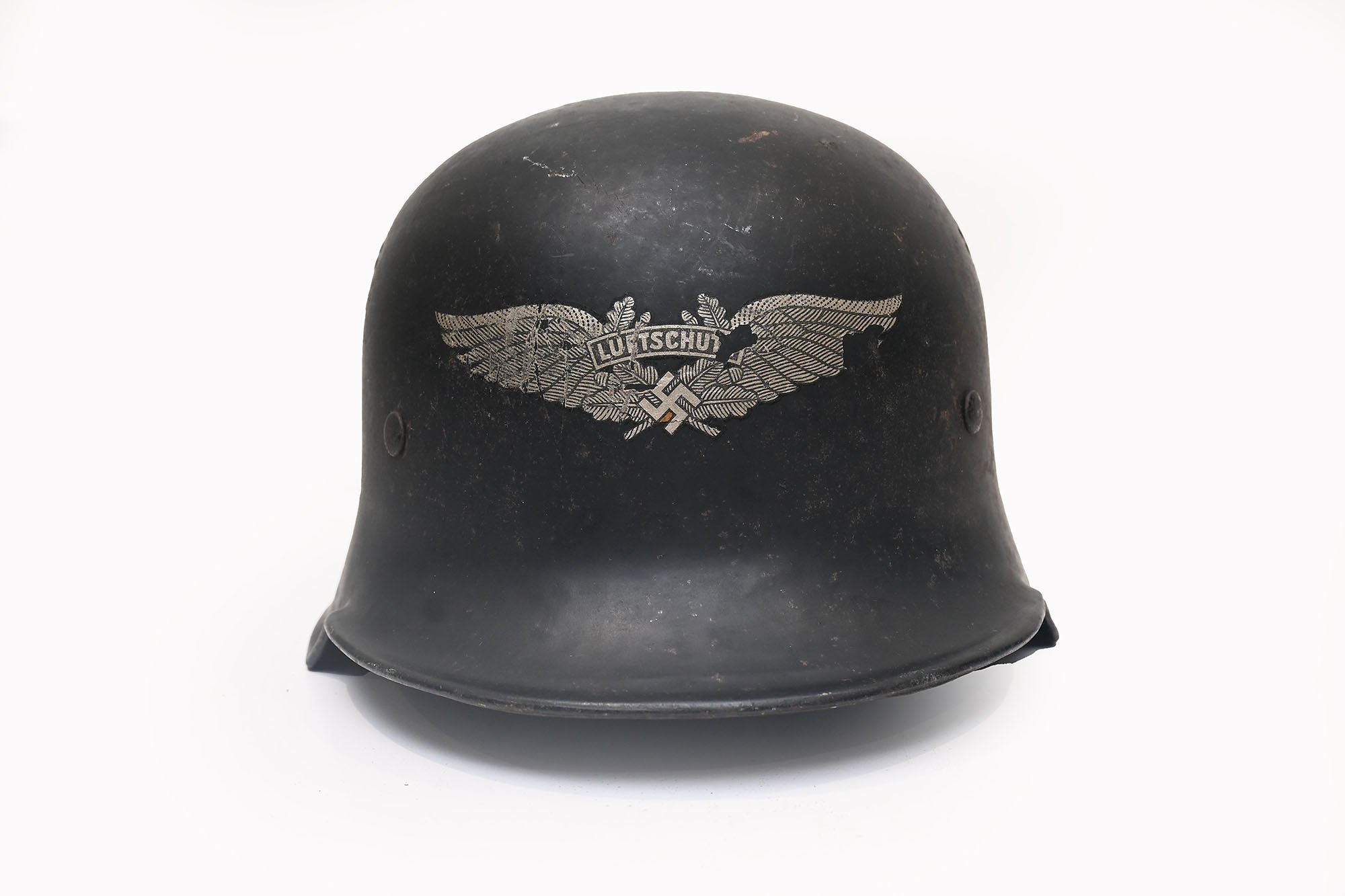 m34 Luftschutz helmet, a German civilair defense helmetfrom World War II. The Reichsluftschutzbund (RLB) was the official national organization responsible forcivil air defense.nice worn helmet which unfortunately is missing the chin strap.
