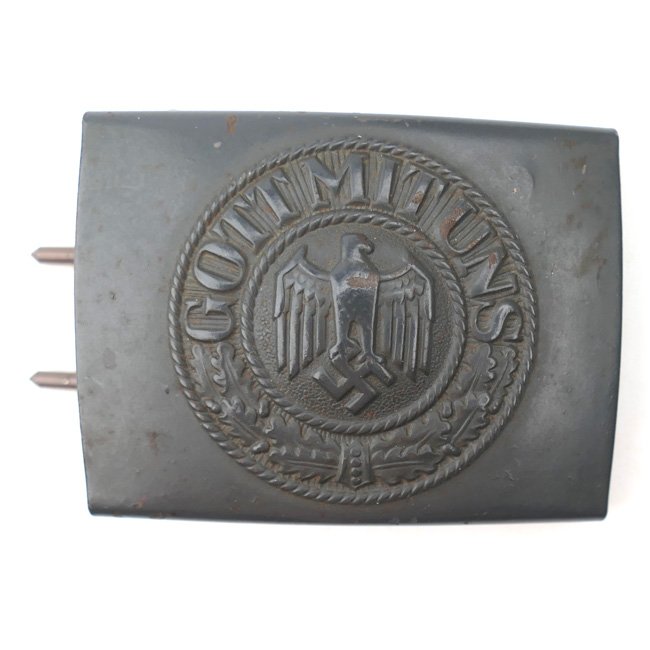Wehrmacht (Heer) Belt Buckle (Koppelschloß). On 24 January 1936 this new pattern EM/NCO's belt buckle was officially introduced to replace the previously worn Weimar era Reichsheer buckle. The basic design of the Reichsheer buckle was retained with the addition of the new Wehrmacht style national eagle. This pattern buckle was worn through-out the Third Reich period with minor manufacturing variations and different colored finishes. The colored finish was determined by regulations depending on what form of uniform it was to be worn with. Nice steel construction box buckle painted in the standard late war blue-grey colour as intended for Heeres or Naval units. The buckle is nicely maker marked with 'JFS' indicating production by the company of 'Josef Feix & Söhne' in Gablonz an der Neiße. The buckle still retains most of its original late-war blue-grey factory paint. Nice and desirable original buckle in very good condition!