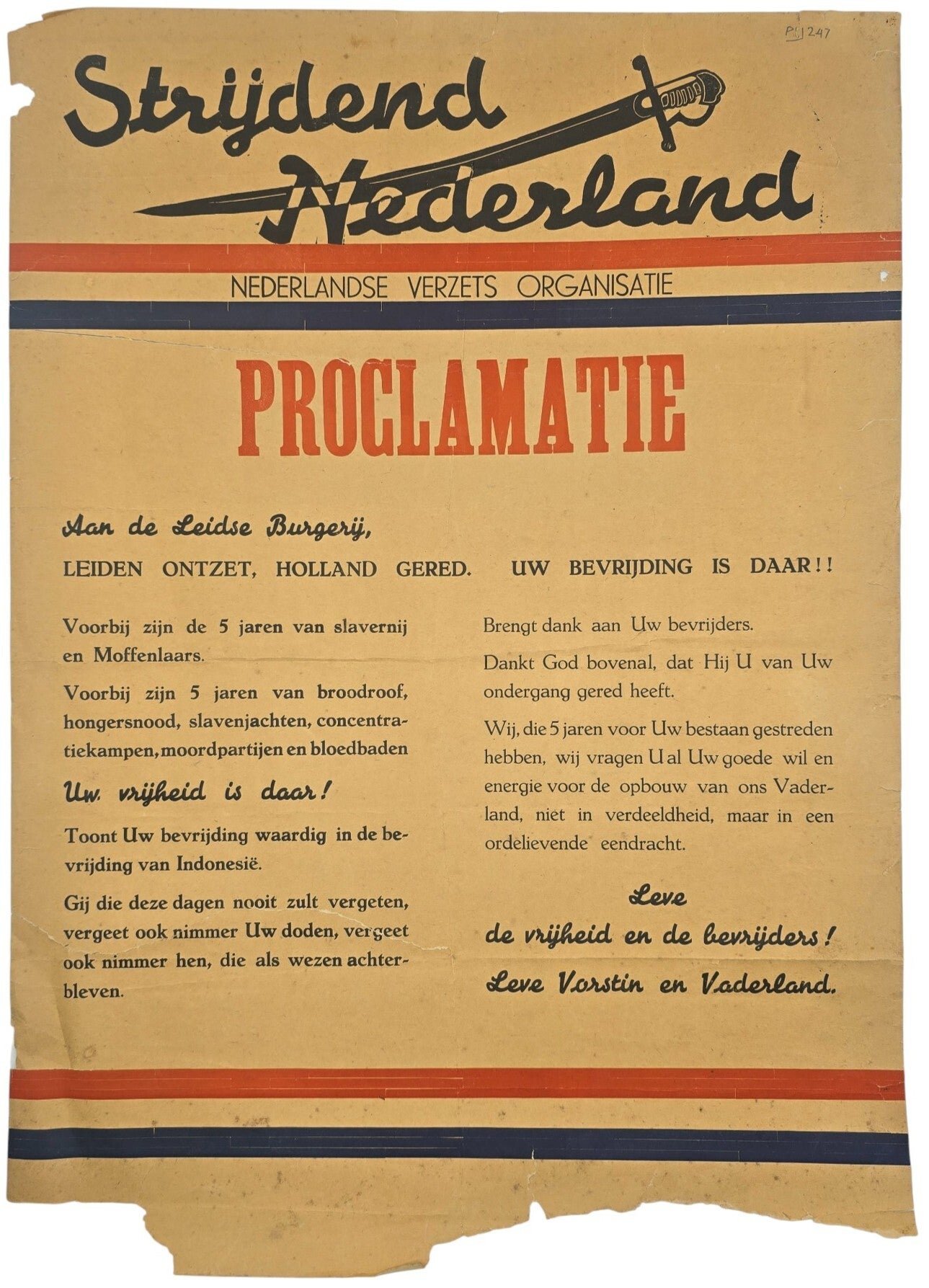 Original WW2 Dutch Liberation Poster - Strijdend Nederland Proclamation resistance, Liberation of Leiden (1945)