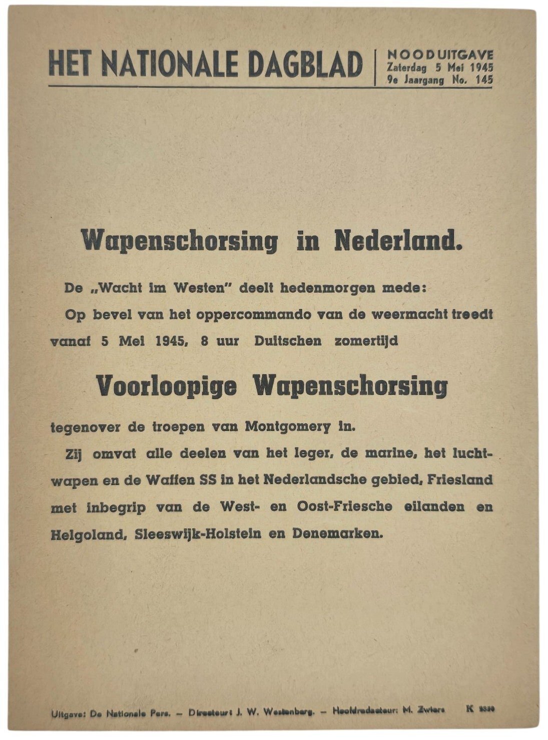 Original WW2 Dutch Collaboration NSB Newspaper - Het Nationale Dagblad, 9th Year No. 145, Emergency edition ''Weapon suspension in the Netherlands'', 5th of May (1945)Late war edition of the Nationale Dagblad, on Dutch liberation day.Originele Wo2 Nederlandse Collaboratie NSB Krant - Het Nationale Dagblad, 9th Year No. 145, Emergency edition ''Weapon suspension in the Netherlands'', 5th of May (1945)Zeer laat oorlogse uitgave van het Nationale Dagblad.