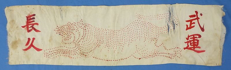 The silk belt is approximately 7-1/4 inches wide when folded by 26-1/4 inches long. The belt lacks any ties and the silk fabric shows separations and spots. It bears kanji for the patriotic slogan of 'Eternal Good Fortune in Battle'.