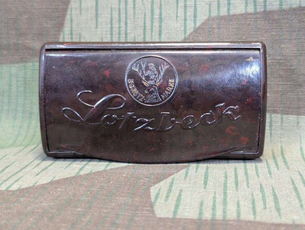 Period German Bakelite Lotzbeck schnupftabak container in good condition. Its actually fairly clean, just a little schmutz around the details of the logo on the lid.