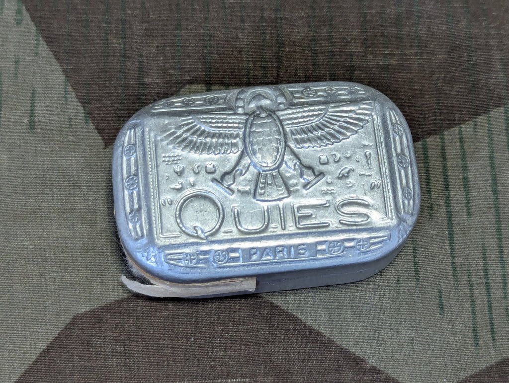 Original Quies Paris French wax ear plugs in the original aluminum tin. The ear plugs are basically the same as the German ones, wax balls covered in cotton fluff so they don't clump together. The tin has a nice art deco Egyptian theme. Fairly good condition with some wear and light dents.