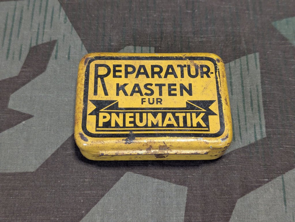 Reparatur-Kasten für Pneumatik tire repair kit tin. Based on the size, it was probably for bicycles or motorcycles. It is in OK condition. It has scratches, rust spots and is a bit dirty.