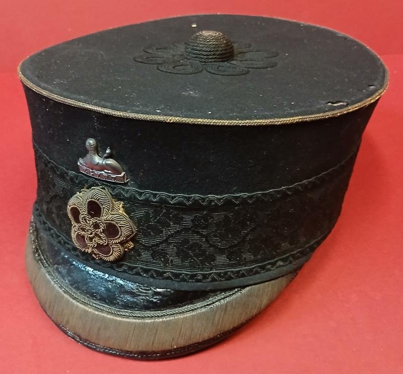 .A FIELD OFFICERS 1880 PATTERN FORAGE CAP.the blue cloth body with a narrow gold lace cord around the crown, the drooping peak with inlaid gold wire, the patent leather crazed. silk lining and buff leather sweatband.The badge displays in embroidered lace and silver coloured metal, the Sphinx/Egypt honour over a separate Lancashire Rose in red and gold lace embroidery, a few small moth holes to the crown otherwise in very good condition.