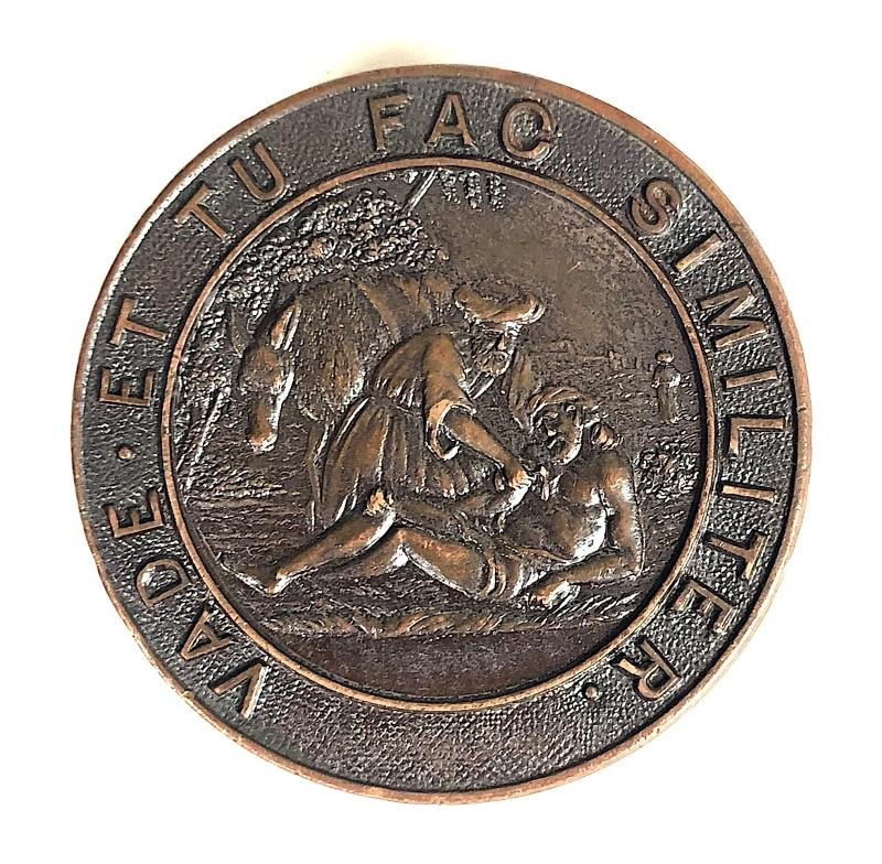 A good original circa mid century period 'Manchester Royal Infirmary pin badge' in the form of a large bronze embossed Latin title circlet 'VADE ET TU FAC SIMILITER (Go and do likewise) the centre depicting a scene from the Good Samaritan; the reverse impressed with the recipients name 'MABEL JOHNSON' 'CERTIFICATED NURSE 904' within a title surround. Very good condition, complete with original pin fittings incorporating safety roller catch in good working order.Diameter approx 38mm.
