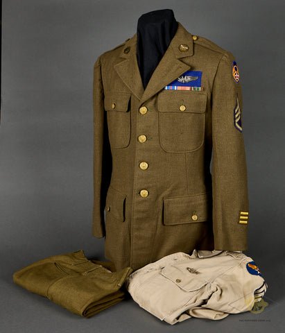WWII USAAF 8thAir Force Uniform Grouping-This is for an 8thAir Force staff sergeant and includes a service uniform, a undershirt and a pair of trousers. The service tunic is produced in an OD wool that is in very good condition, with very minor wear, minor discoloration and a tiny moth nip in the left breast pocket. There is a four button closure and all buttons are gilt finished in the military style. There are four pockets with straight flaps. The breast pockets are plain and the lower pockets are internal. The right lapel has the US collar disc while the left side has the winged propeller of the USAAF. The left sleeve has an embroidered 8thAir Force shoulder patch, a staff sergeant patch and 3 gold bars for 18 months of overseas service. The right side has another staff sergeant insignia. There are sterling silver wings for an aerial gunner. There is a ribbon bar which has the Distinguished Flying Cross ribbon to go along with the Good Conduct and the EAME with two stars. The interior is partially lined in golden brown cotton. The tunic is stamped with the size 38S. The trousers are produced in a very similar type of wool. They are also in very good condition. They are pleated and have both hip and rear pockets. There is a four button fly with an additional button at the waist. The waist is a size 28 and these are 38' in length. These are named a few times inside. The name is S Switak and the last four numbers of his ASN are 7483. Finally, there is a heavy cotton shirt that is light tan in color. It has a pair of pockets with straight flaps. There is a six button closure. It has staff sergeant insignia on each sleeve plus a USAAF patch on the left shoulder. There is a set of miniature sterling silver wings for an aerial gunner.A great set!