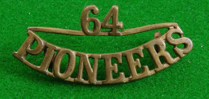 Scarce brass shoulder title, ' 64 / Pioneers'