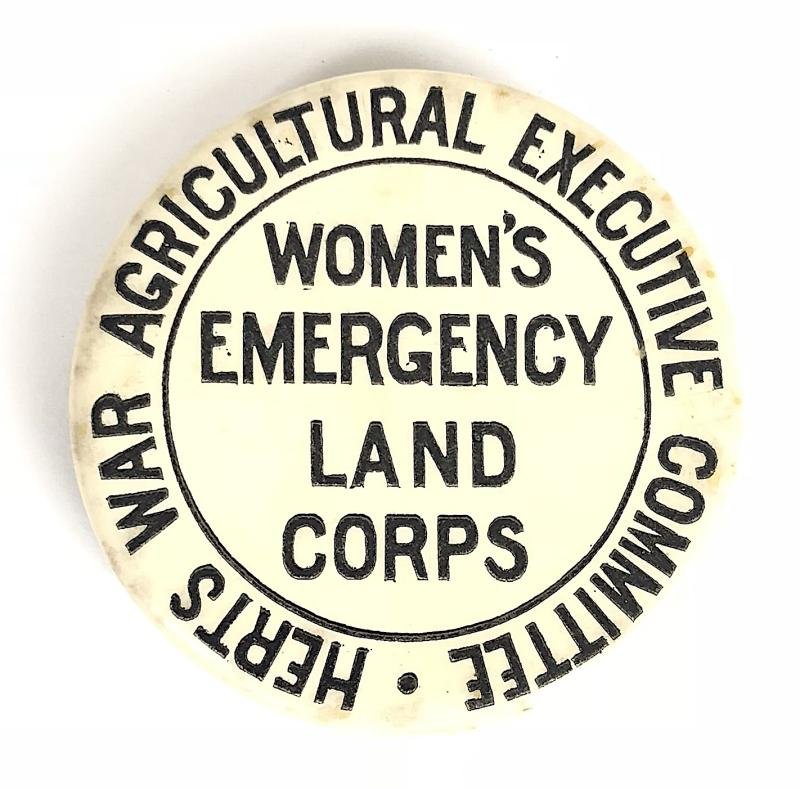 A rare original First World War period 'Women's Emergency Land Corps badge'; large white celluloid pin button, bearing black printed 'HERTS WAR AGRICULTURAL EXECUTIVE COMMITTEE title surround and inscribed 'WOMEN'S EMERGENCY LAND CORPS' to centre. Good condition, complete with original pin fitting, no cracks, minimal foxing.Diameter approx 44mm.Hertfordshire Women's War Agricultural Council Executive Committee held its first meeting on 12 April 1916 with the Hon Mrs Abel Smith in the Chair.