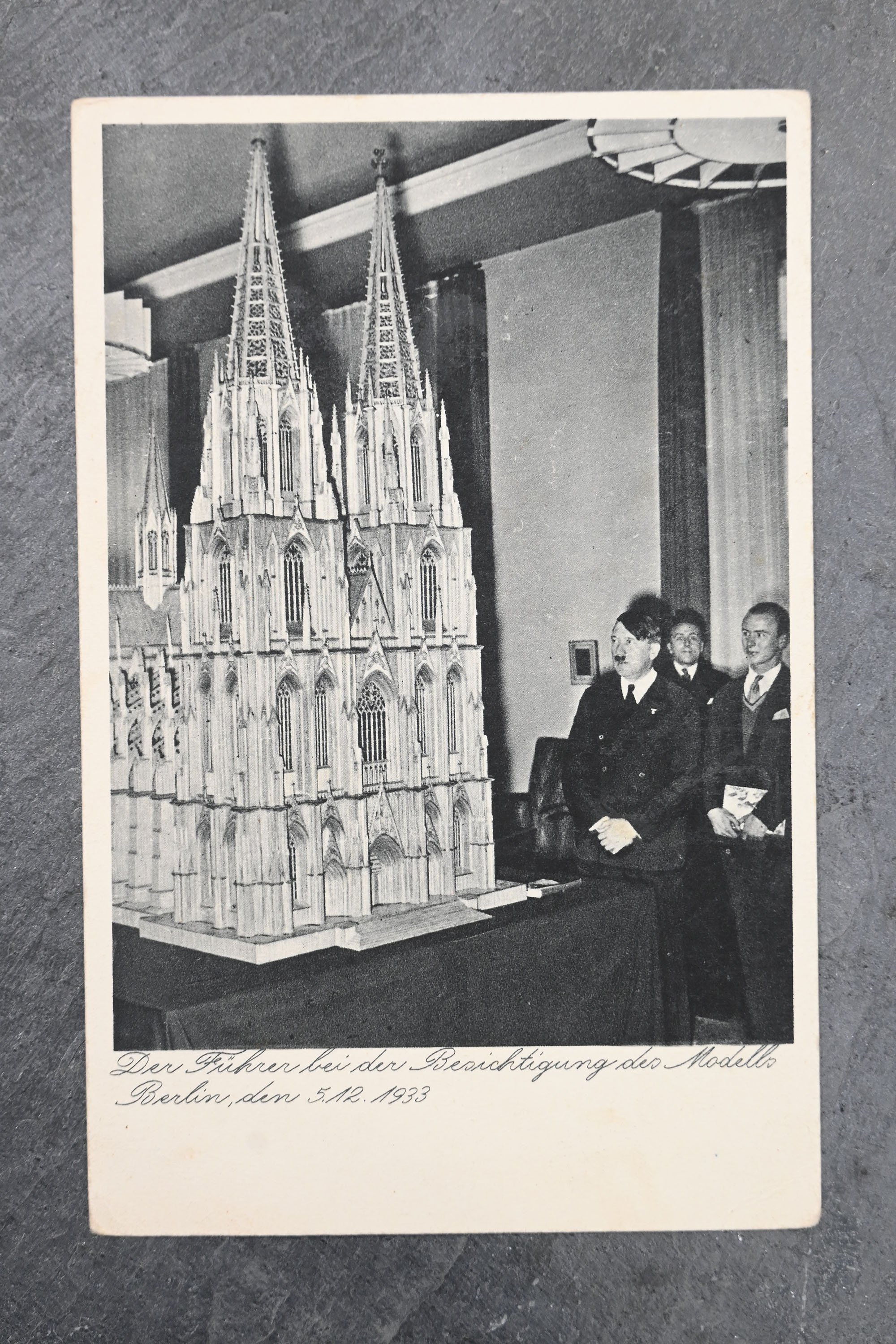 Very beautiful German postcard depicting Hitler next to the scale model of the Cologne Cathedral.