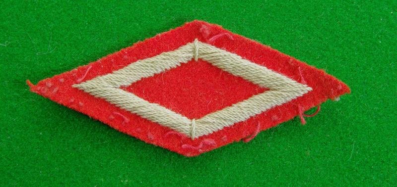 Early pattern embroidered in white on scarlet sleeve badge worn by Volunteers with efficiency in drill and rifle practice. A white diamond within a red diamond.