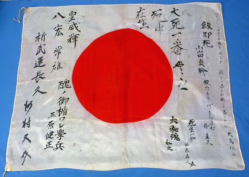 The silk flag is approximately 27 inches by 33 inches. Two corners are reinforced and retain cord ties. The flag has several scattered tiny holes, but overall the flag is in very good condition. The flag bears slogans and declarations which include: 'Continued Luck in the Fortunes of War'; 'Imperial Magnificence Spreads Throughout the Eight Corners [of the World]', which is signed 'Tsuneo'; 'Ugly Shield, I: Student Soldier'(The phrase 'Ugly Shield, I, Student Soldier' is a means of saying 'I am a soldier who will risk my life to serve as a shield (an ugly shield) to protect the Emperor', and it expresses a self-deprecating yet determined willingness to sacrifice for one's country. It was particularly used in wartime Japan to express the spirit of 'sacrificing one's life for one's country without regard for oneself'); 'Sword Marked by Death'; 'A Great Death is the Utmost…This is Nothingness' (meaning exerting oneself to the utmost, and prepared to die if necessary); 'While dying there is life'; 'Life and Death are One'; and 'Soul and Spirit of Japan'.