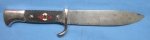 Original period manufacture. Standard HJ knife with the Blut und Ehre motto on the blade, Ludwig Groten maker logo. The blade retains its proper configuration, showing areas of corrosion pitting near the point. Black plastic grips with an original diamond set into the grip. Magnetic, chrome plated guard and pommel. No Scabbard.