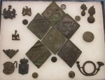 Original period manufacture. Collection of 22 pieces of assorted brass insignia, each recovered along the route of Napoleon's Grand Armee's invasion of Russia in 1812. The lot includes, 6 pattern 1810 shako plates, 5 coat buttons with regimental numbers, 3 eagle emblems, 2 grenadier bursting bomb insignia, 1 light infantry bugle emblem (likely from a cartridge box flap), tip of a cavalry baldric, bridle rosette, one half of an artillery officer buckle, and a crowned shield with eagle. Included is a file history I prepared on each of the six shako plates, providing details on their service during the Napoleonic Wars. Some of these artifacts were recovered from the Berezina river crossing point, where in November of 1812, the Grande Armee was compressed into a bottleneck on the banks of the river. Thousands of the panicked Grande Armee survivors lost their lives as they attempted the crossing of the freezing river, while under Russian fire. I began collecting these artifacts about 15 years ago, finding them to be poignant, fascinating relics from one of the most famous military campaigns in history. Their state of condition is quite remarkable, with the quality of the insignia being quite sound and sturdy.