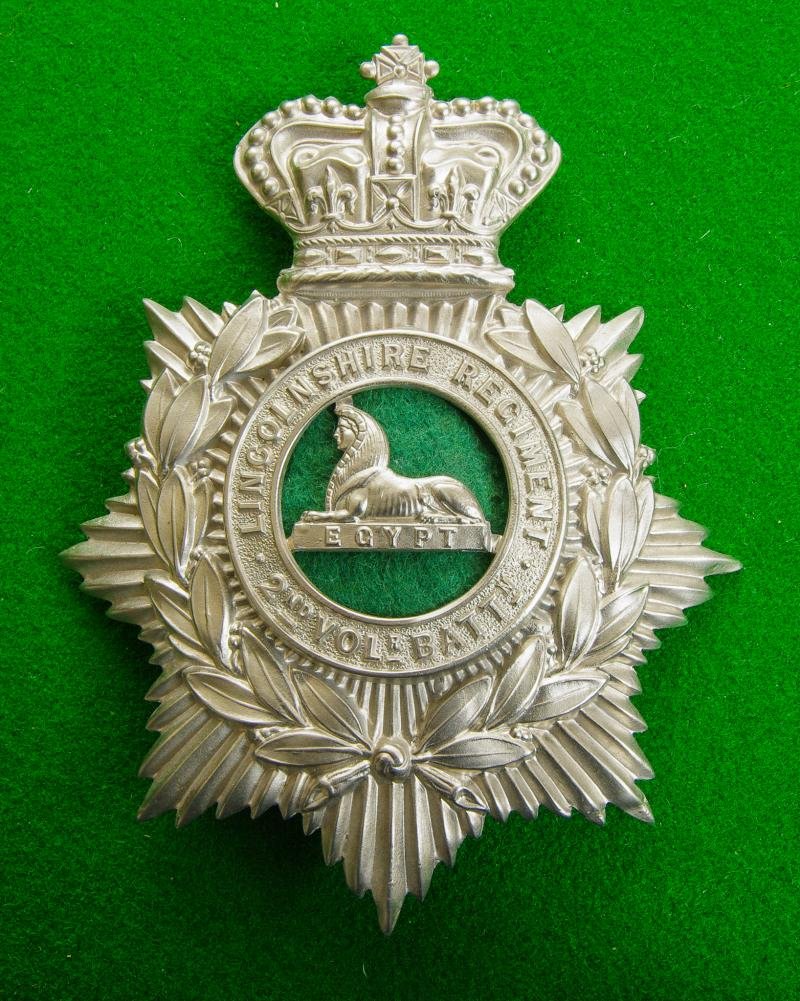 Victorian white metal other ranks Home Service helmet plate with three loops and later added green cloth backing to the centre. The sphinx and Egypt honour to the centre of a circlet bearing the title, ' Lincolnshire Regiment 2nd. Volr. Battn.' within a wreath of laurel on a multi-rayed crowned star plate. {2nd. V.B Headquarters at Grantham}