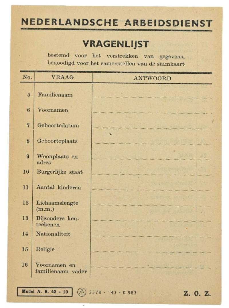 In a very good condition a Dutch NAD (Nederlandse Arbeitsdienst) Member Application Form.The form is dated 1943.
