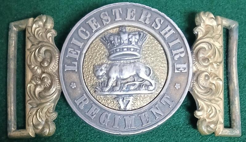 .THE 17TH (LEICESTERSHIRE) REGIMENTA fine silver and gilt interlocking example with matching bench numbers to both halves circa 1869-1881. Circlet inscribed 'THE LEICESTERSHIRE REGIMENT'; seeded gilt centre mounted with silver crown. Tiger & Regt Number.L.B.RYAN BOOK Pg 7, Illustration 26
