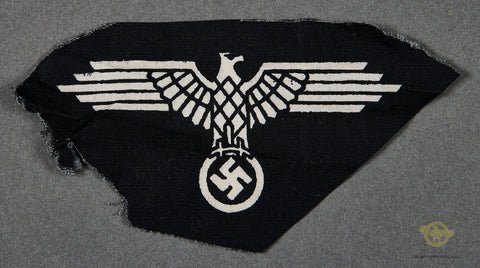 German WWII Late War SS Eagle-This is very late war, and is in the screen printed variant. These would be worn on the sleeve by enlisted men and NCOs. We have four of these and the one you receive will be as good if not better than the one in the photo. These are all in excellent condition.Now let me tell you how Bill acquired these. 40 years ago, a friend of his named Joe Sweeny had to drive his wife to a fabric store in Springfield Massachusetts. He didn't want to go into the fabric store, but he didn't want to wait in the car either, so he went in with his wife while she browsed fabric. As she was looking through fabric samples, he spotted a black sheet, with 500 printed SS eagles on it. It was priced $35! Of course, he was so excited that he didn't wait in the car that day.Joe spent 20 years selling these eagles individually. Bill bought 125 of them and sold all of them. These are a few that we were able to buy back over time. We are now offering them to you, with a great story.