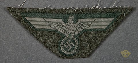 German WWII Army Combat Breast Eagle-This is a very good example of a BeVo army breast eagle that was cut from a section of green wool tunic. This was cut in a triangle around the patch. There is still a portion of uniform lining that you can see on the reverse. This is in excellent condition.
