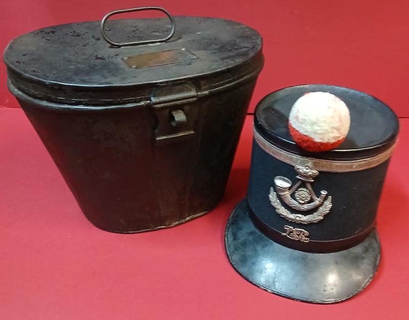 .1860'S OFFICERS SHAKO & TIN.An officer's shako of the Liverpool Volunteeer Rifles c. 1860, with silver coloured multi piece badge and silver band, the inside of the crown bearing maker's label of Nixon & Kirsop, Hatters, Glasgow. GC the lining detached, no chin strap; with a red feather hackle in silver coloured holder; in a black japanned tin with brass plate engraved Dr. Williams Rifle Brigade,