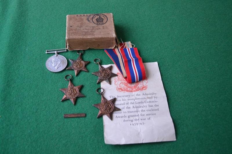 Group of five medals being, 1939/45, Atlantic, Italy, Africa stars, 1939/45 medal and France and Germany bar, complete with box of issue and paper slip.