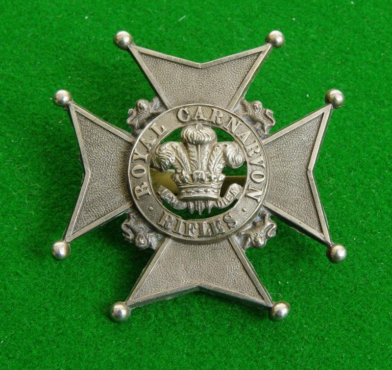 Scarce white metal 1850's officers pouch-belt plate with two blades {replacing the screw bolts} to the reverse. The Prince of Wales's plumes to the centre of a circlet bearing the title, ' Royal Carnarvon Rifles' on a maltese cross. {See Bryn Owen's book 'Anglesey and Caernarvonshire' page 87} {Approx 5.5 x 5.5 cms.}