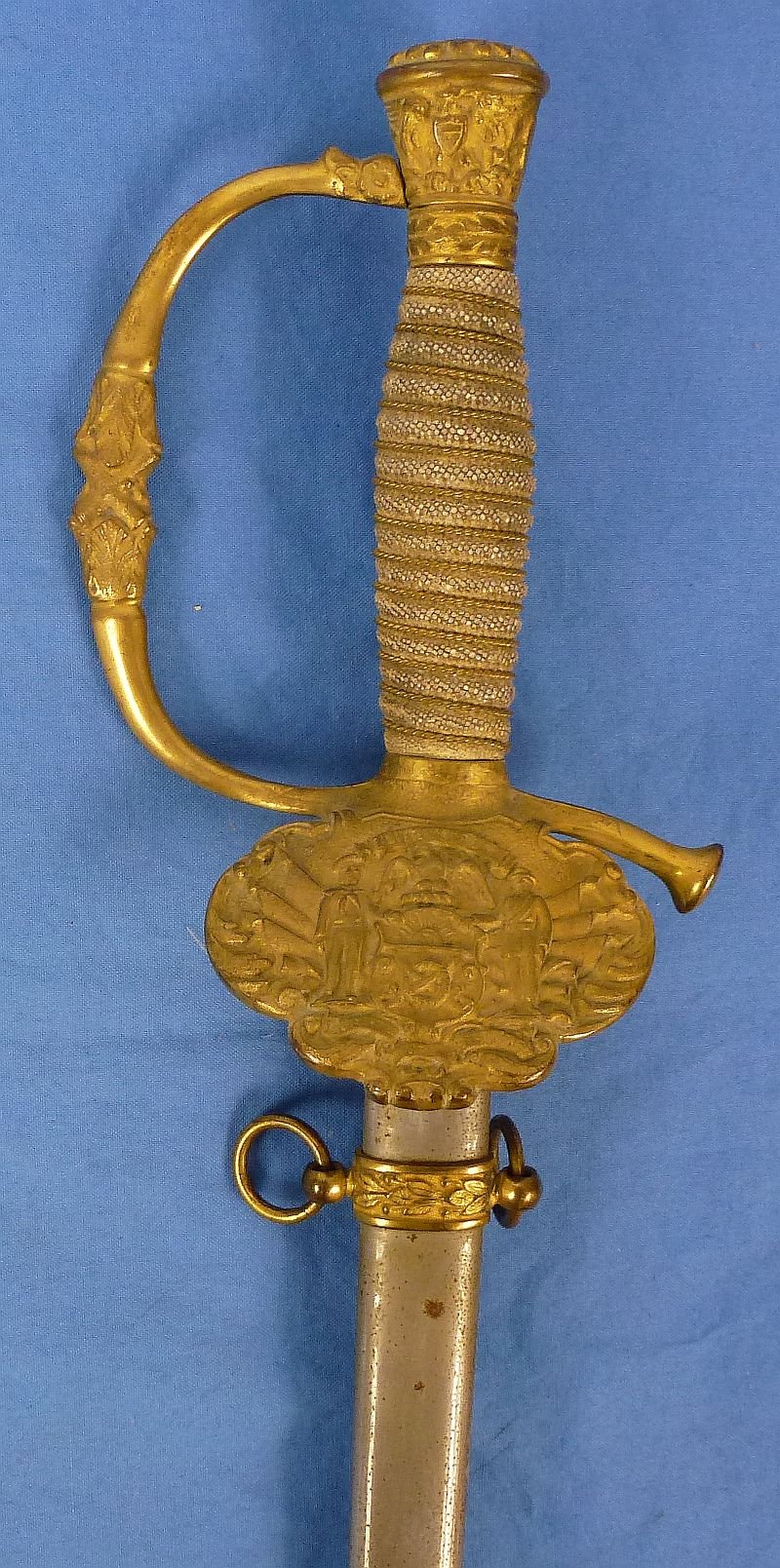 The sword has an overall length in the scabbard of approximately 38 inches. The straight etched blade displays a few spots, but the blade makes an excellent appearance with crisp etched motifs. The grip is covered in sharkskin and tightly wrapped with twisted wire. The guard, knuckle bow, and the pommel all retain a toned gilt finish. The scabbard shows spots of rust and plating loss, with an overall uncleaned patina. Overall the sword is in very good condition.