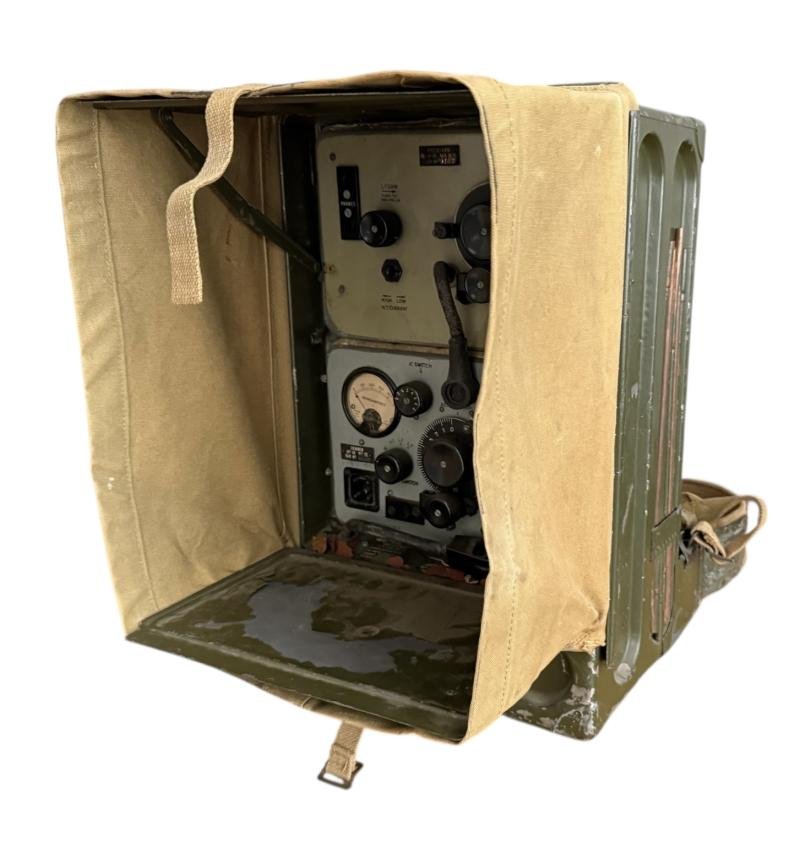 A very original British Army No. 18 Wireless SetThis man pack transmitter-receiver set was introduced into service during 1940 for short range communication in forward areas between Battalion HQ and Company HQ. It was designed to be portable and could be worn on a soldier's back using a harness and belt system and they saw widespread issue throughout the British Army for the duration of WW2.This example is very original and complete. Whilst many offered onto the market today have missing or replacement reproduction parts, this example has survived in excellent original condition due to having been part of a museum collection for many decades. The metal case that houses the transmitter and receiver is in excellent condition and retains the vast majority of its service green coloured paint finish which would suggest that it is of mid-war manufacture The signals stores reference iof Z.A.3240 is also present to the top as is the original metal data plate which bears the title 'Wireless Set No. 18 MK' below which is the serial number.Of particular note is the original canvas cover which is in good condition. These are often missing but this example clearly retains its original cover. . All of the straps are also original as is the waistbelt which bears the maker's initials of 'MECo' which denotes the maker as Mills Equipment Company, below which is the signals stores reference number of Z.A.21524.The radio also comes complete with a set of sectional rods which are fitted to each side of the set.The 18 set is in good condition as can be seen in the pictures. There are some signs of wear and age and it has not been cleaned,The set comes with all accessories as Headphone, Microphone, Morse (Signal) Key, Spare Tubes, Satchel Bag complete with waist belt and straps.Overall a very original and complete example which would make an excellent addition to any WW2 collectionPlease note payment can only be made by bank transfair or cash