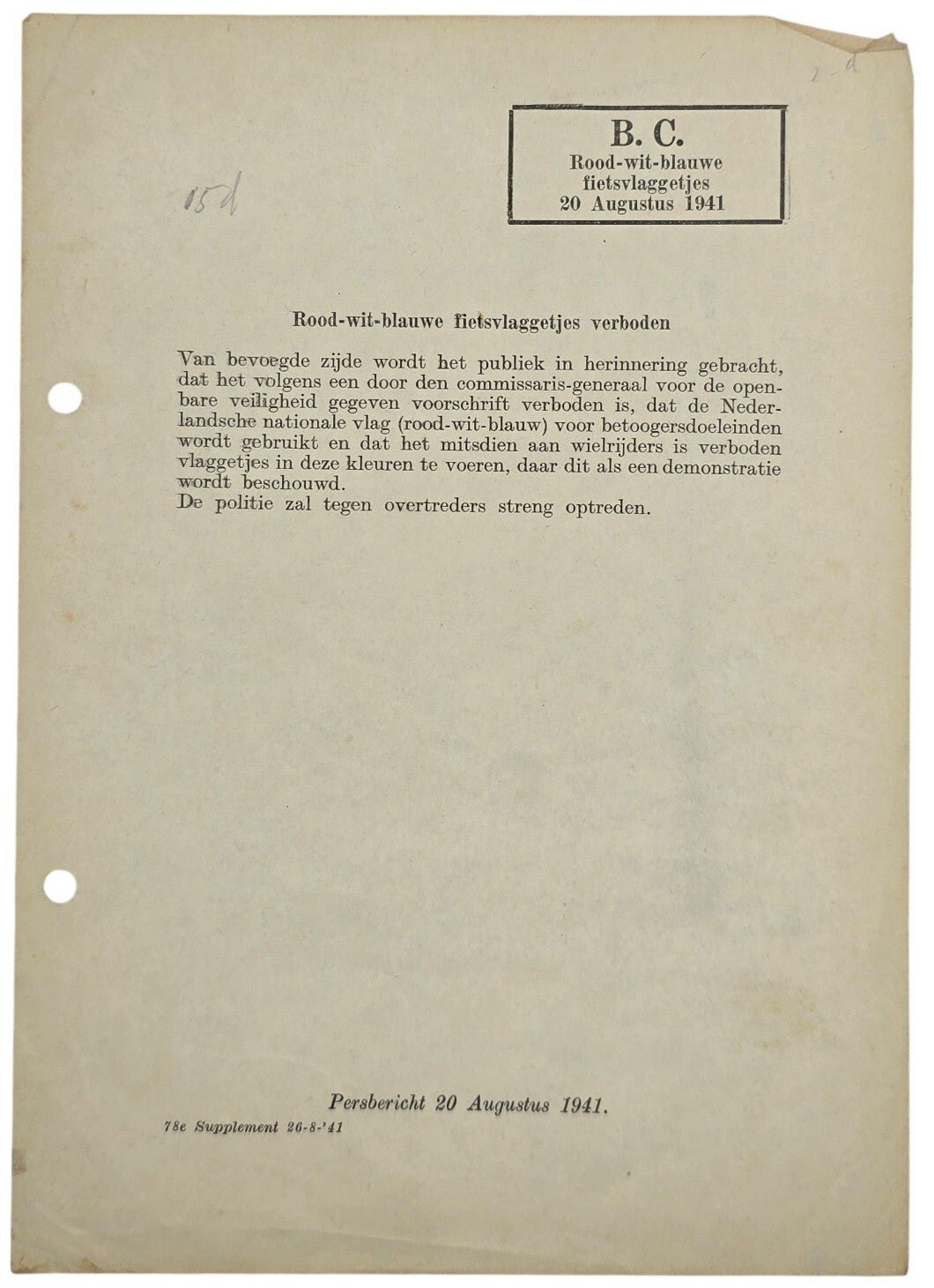 Original WW2 Dutch Document - Law against Dutch bicycle flags (1941)Law against the Dutch bicycle flags depicting the flag of the Netherlands.Origineel Wo2 Nederlands Document - Wet tegen Nederlandse fietsvlaggen (1941)Wet tegen Nederlandse fietsvlaggen met de Nederlandse vlag erop.