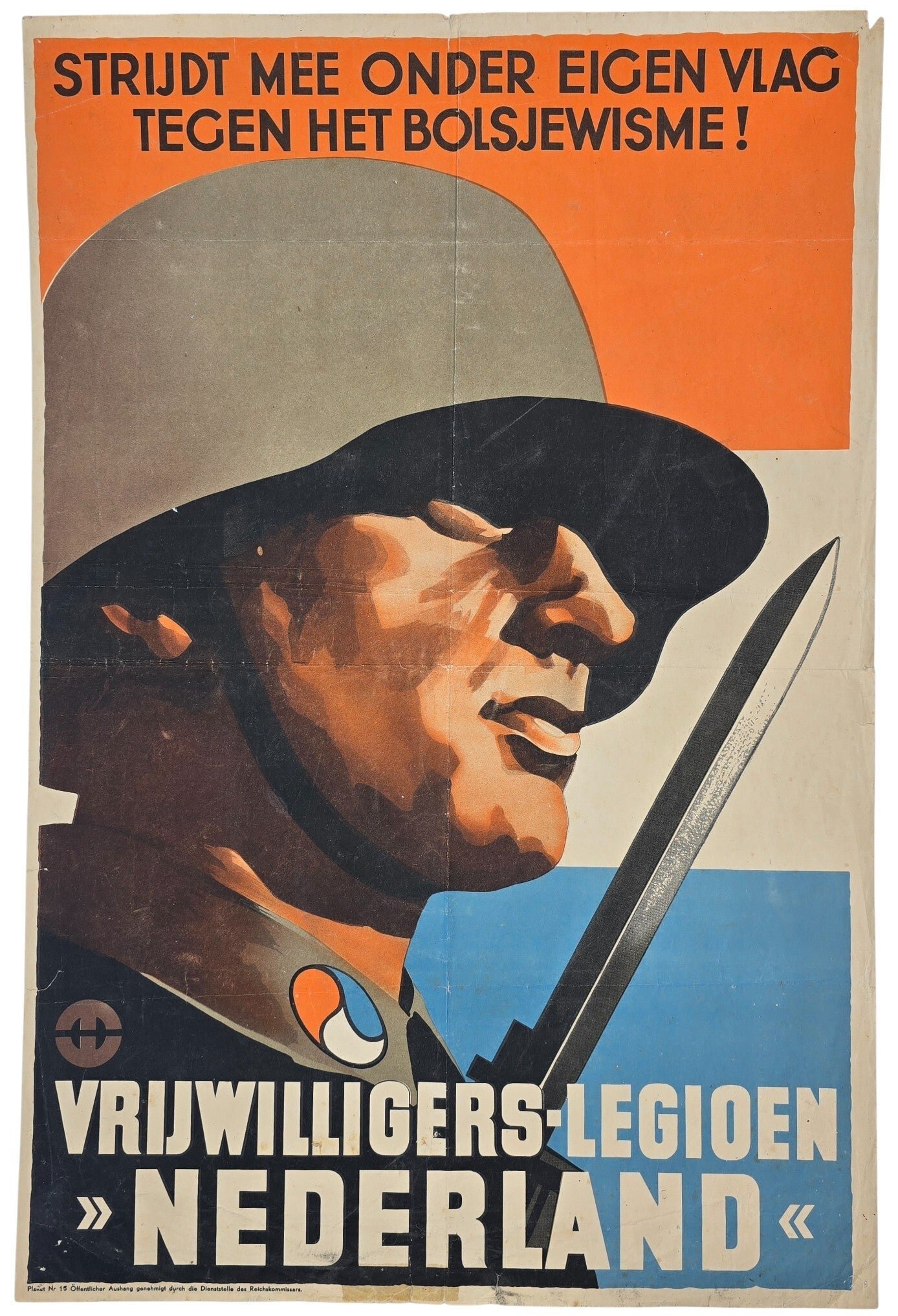 Original WW2 Dutch Waffen SS Poster - Strijd mee onder eigen vlag tegen het Bolsjewisme! Vrijwilligers Legioen Nederland (1941)Approximately 60 x 40 cmExtremely rare early Dutch Waffen SS poster for the Vrijwilligers Legioen Nederland. The poster features a Dutch soldier with a bayonet, standing in front of a Dutch Prinsenvlag behind him.The poster is in fine condition; it has a few small tears and shows signs of wear. On the bottom, there was a tape stuck on the backside, which has been removed. Ex-libris stamps on the back.This poster is not offered frequently and is one of the most desired Dutch Waffen SS design posters out there.Originele Wo2 Nederlandse Waffen SS Poster - Strijd mee onder eigen vlag tegen het Bolsjewisme! Vrijwilligers Legioen Nederland (1941)Ongeveer 110 x 81 cmExtreem zeldzame vroege Nederlandse Waffen SS-poster voor de Vrijwilligers Legioen Nederland. De poster toont een Nederlandse soldaat met een bajonet, staand voor een Nederlands Prinsenvlag.De poster is in goede staat; er zijn enkele kleine scheurtjes en gebruikssporen. Aan de onderkant zat een stukje plakband, dat inmiddels is verwijderd. Ex-libris stempels op de achterkant.Deze poster wordt niet vaak aangeboden en is een van de meest gewilde Nederlandse Waffen SS-posters.
