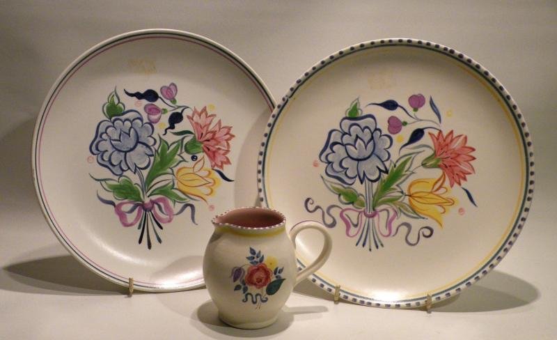 Here is a nice set of three pieces of vintage hand painted Poole pottery comprising a pair of plates and a decorative jug, all are well marked on the bases, the plates measure 10 inches in diameter and come in very good condition and the jug stands 4 inches high and is also in good order.