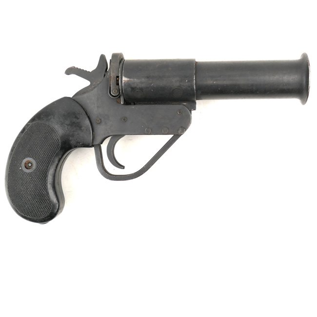 British No.1 Mk 5 Flare Gun (No. 1 Mk. V Signal Pistol). These Signal Pistols were used by British & Commonwealth Military Forces during the Second World Wars. The pistol is having a steel frame and barrel, the handle is having two bakelite grips which are held in place by a screw head bolt, the grips are in good condition. The pistol is bears a serial number '152461'. Nice example in good used condition, see photos. This is an original pre-1945 flare gun, exempted by the Dutch law inArticle 18, paragraph 1, in d, annex II of the Rwm (Regeling Wapens en Munitie). Sale only to persons above the age of 18 and please check your country's regulations before purchasing!