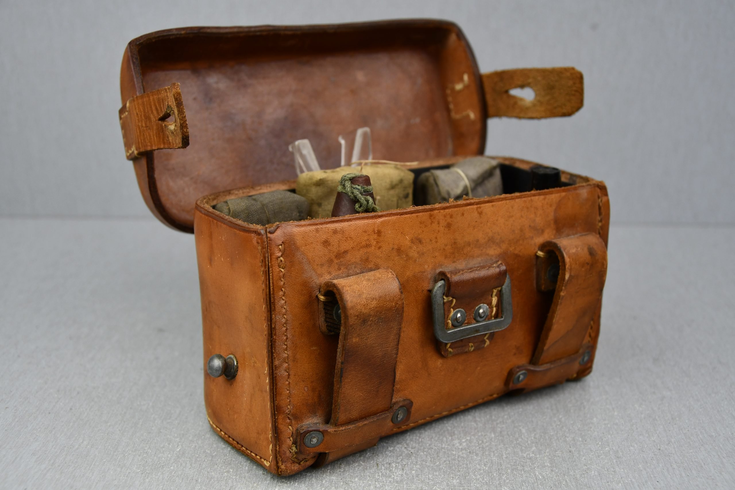 This is an original German WWII Sanitäter medical pouch, a particularly interesting and uncommon political example associated with the SA (Sturmabteilung). The pouch is constructed from brown leather and shows honest age and wear, while remaining solid and complete. On the reverse it is clearly marked with an 'S' forSanitäter, with an 'R' beneath it, indicating right-side wear. On the top flap the pouch is embossed with the SA emblem, with 'NSDAP' beneath it, firmly identifying this as a political medical pouch rather than a standard Wehrmacht issue piece.The leather pouch itself is in good original condition, with a pleasing natural patina. The stitching remains intact, the closure functions correctly, and the leather retains good body without cracking or repairs. Marked examples like this are considerably scarcer than unmarked or standard army medical pouches and are highly sought after by collectors of political and paramilitary Third Reich equipment.The pouch has been carefully completed by the collector with period-correct medical contents, as shown in the photographs. These include original bandages, wrapped dressings, small medical containers, and pharmaceutical items such as a Bayer Aspirin packet, all consistent with German wartime medical issue. While the contents are not guaranteed to be an untouched original set as issued, they are appropriate, original-period items and significantly enhance the display and historical presentation of the pouch.Overall, this is a very attractive and display-worthy SA Sanitäter medical pouch, combining clear political markings, correct medical function, and a complete interior. It would make an excellent addition to any advanced collection focusing on German WWII medical equipment, SA or NSDAP-related material, or for use in a high-quality display or mannequin setup.