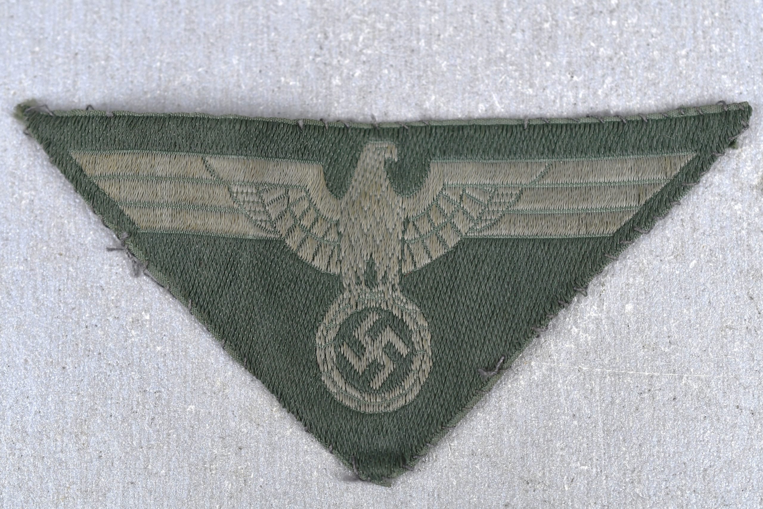 Standard late war M44 pattern breast eagle. Flat woven 'BeVo-weave' example on pale green backing. Issued on M43 and M44 feldbluses. Maker marked by BEVO WUPPERTAL.