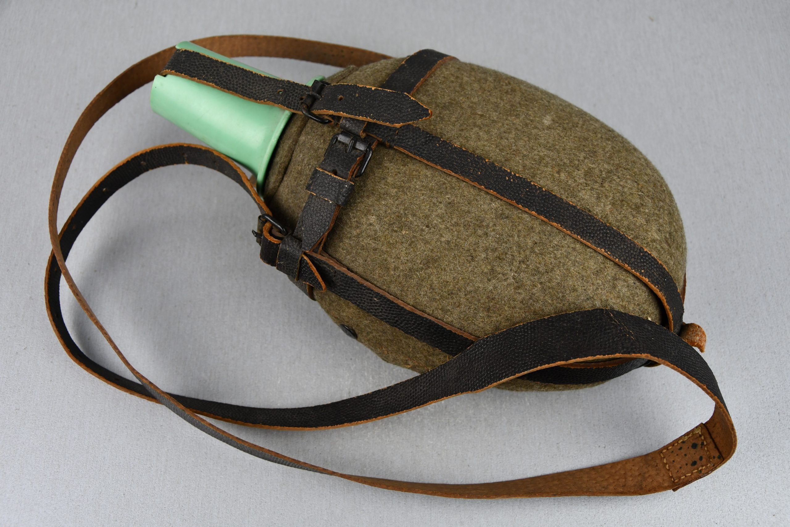 This extremely rare Wehrmacht Sanitäter field canteen is an original 2-liter example in outstanding, untouched condition. Large-capacity canteens were issued to medical personnel who required a significantly greater water supply, but while 1-liter and 1.5-liter variants are occasionally encountered, true 2-liter examples are exceptionally rare. After extensive research, no directly comparable 2-liter Sanitäter canteen in this configuration could be found publicly offered or documented, making this piece a genuine top-level rarity.The canteen is constructed with an aluminium flask and retains its original felt cover and complete leather strap system. All straps are present, fully intact, and in very good condition, with no tears or repairs. The leather remains strong and supple, all buckles function correctly, and the felt cover shows only natural aging. The piece has never been cleaned or restored and still displays original dust and patina from long-term storage, confirming its completely untouched state.A particularly notable feature is the original green bakelite cup, an extremely rare variant that is seldom encountered. The cup is complete and original, showing a small hairline crack consistent with age and long-term storage, but without missing material or structural weakness. This minor flaw does not detract from the rarity or historical value and is typical for bakelite items of this period.The canteen is marked by ESB, with components dated 1942 and 1943. This mixed dating strongly suggests production around the turn of the year, a common wartime practice where available parts were assembled together. All markings are clear and original, with no signs of later alteration. Recently discovered in Germany as an attic find, this Sanitäter canteen has remained preserved exactly as it was found, offering a rare opportunity to acquire a museum-quality Wehrmacht medical item in truly original condition.Due to its extreme rarity, large 2-liter capacity, Sanitäter issue with rare green bakelite cup in complete condition this is a highly desirable centerpiece for any advanced Wehrmacht or medical equipment collection.