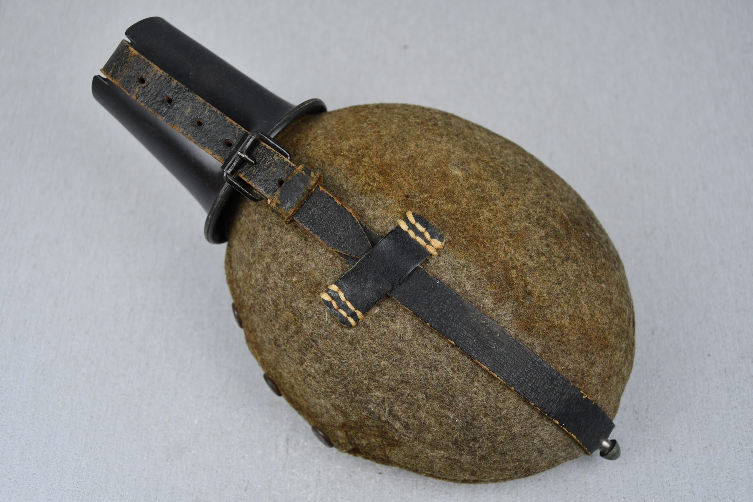 Standard issue mid war Wehrmacht canteen. Red enameled bottle marked SMM 1943, as well is the cover and pig skin strap. Comes with a reproduction drinking cup.