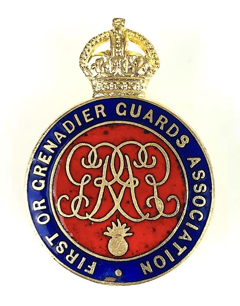 A scarce original circa pre-1936 period 'First or Grenadier Guards Association membership badge'; large gilt brass Crowned blue enamel title circlet bearing King George V cypher to centre on red enamel ground; the reverse impressed with maker's details 'J.R.Gaunt & Son London'. Good condition, complete with original buttonhole lapel fitting, minor nick to the enamel in the 6 o'clock position.Height approx 36mm.