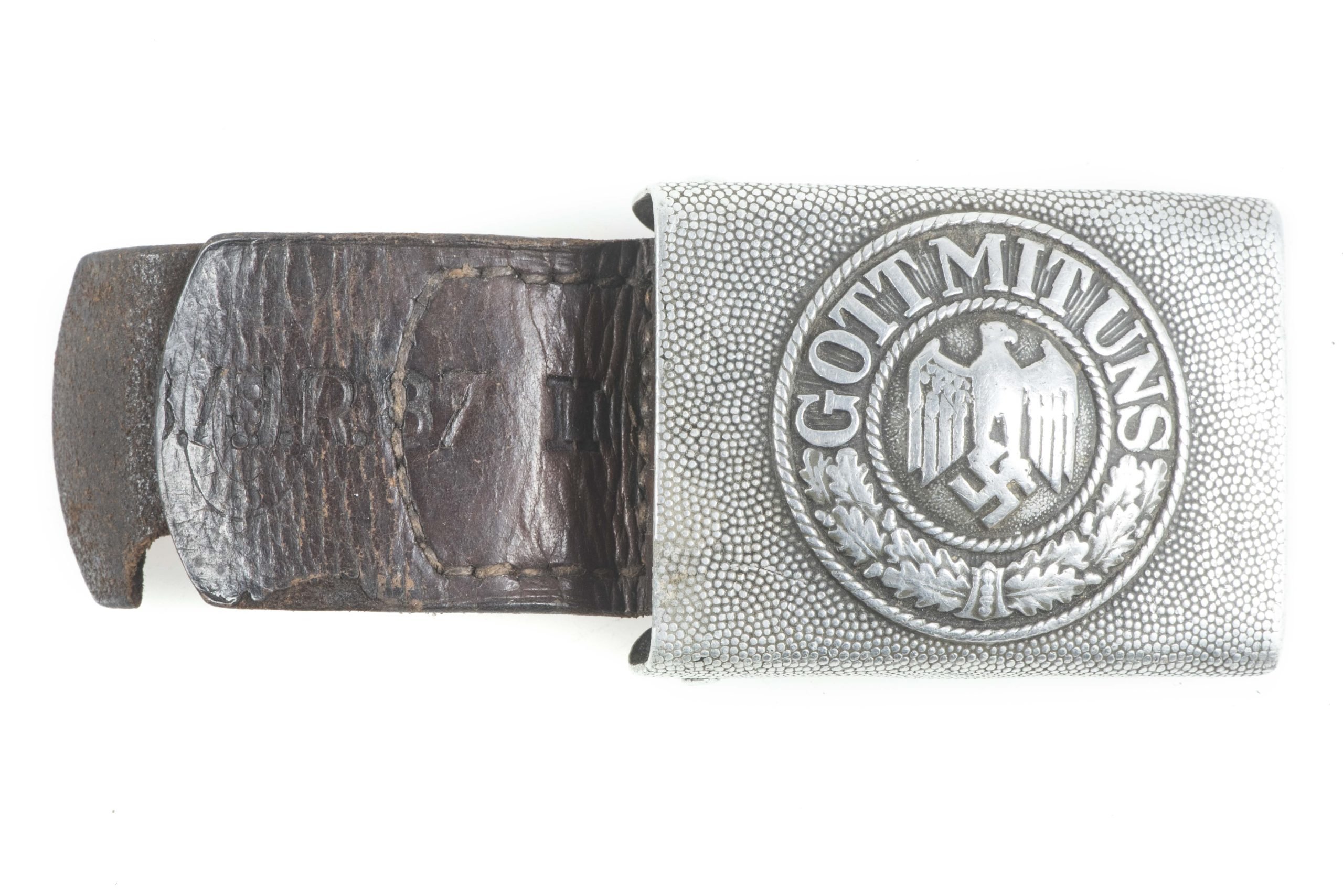 Tabbed aluminium belt buckle marked Dransfeld & Co 1938 and the unit marking 3./J.R.37 indicating 3 Kompanie, Infanterie Regiment 37. This unit partook in the 1940 campaigns trough Luxemburg, Belgium and France.