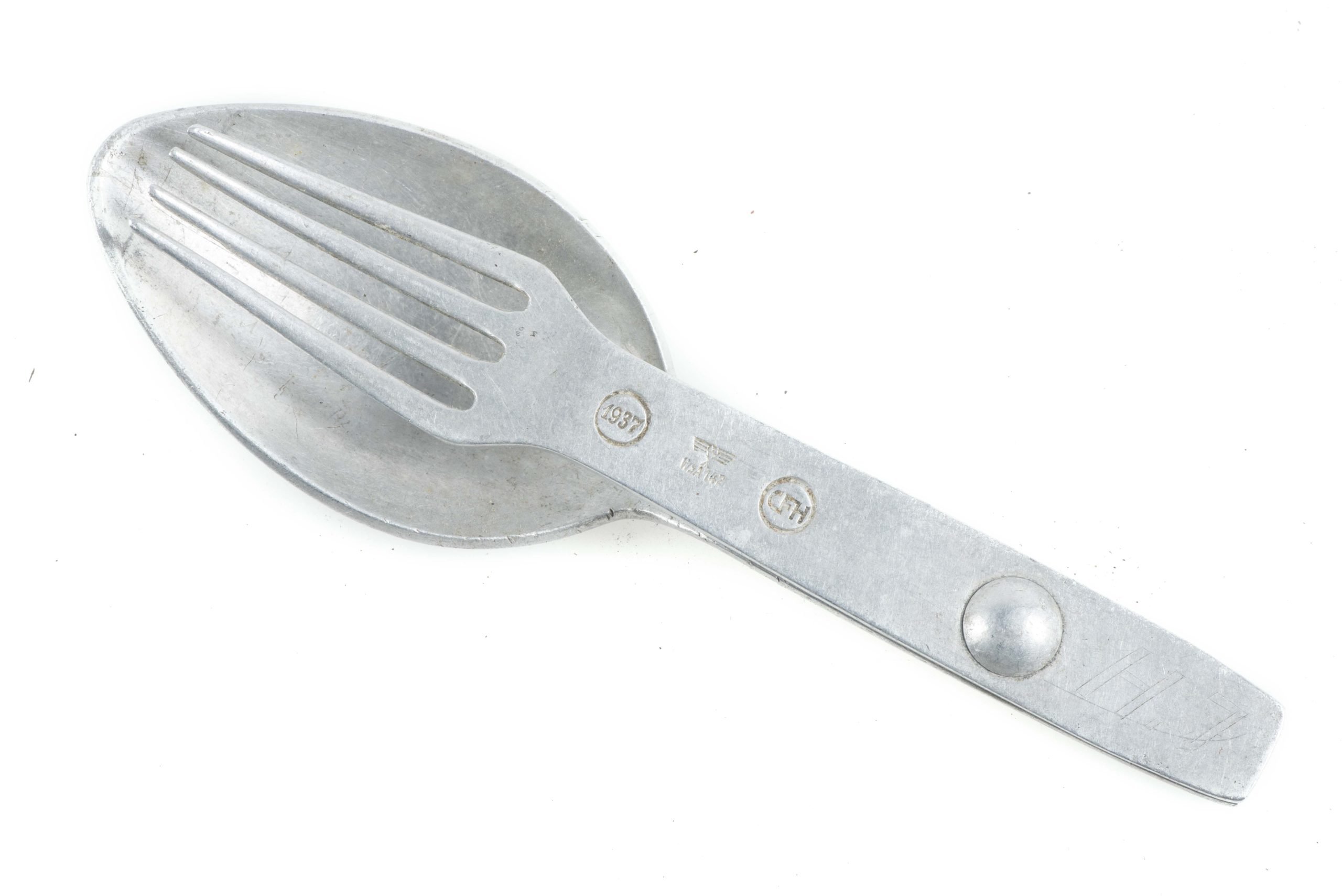 Excellent and textbook pattern pre war Göffel in good used condition. The fork spoon combination shows normal signs of usage. The Göffel is nicely marked CFH 1937 and with the WaA 142, it is unclear which manufacturer this indicates. This maker is easily recognizable by the large and unusual rivet. Excellent and rare 1937(!) dated Göffel!