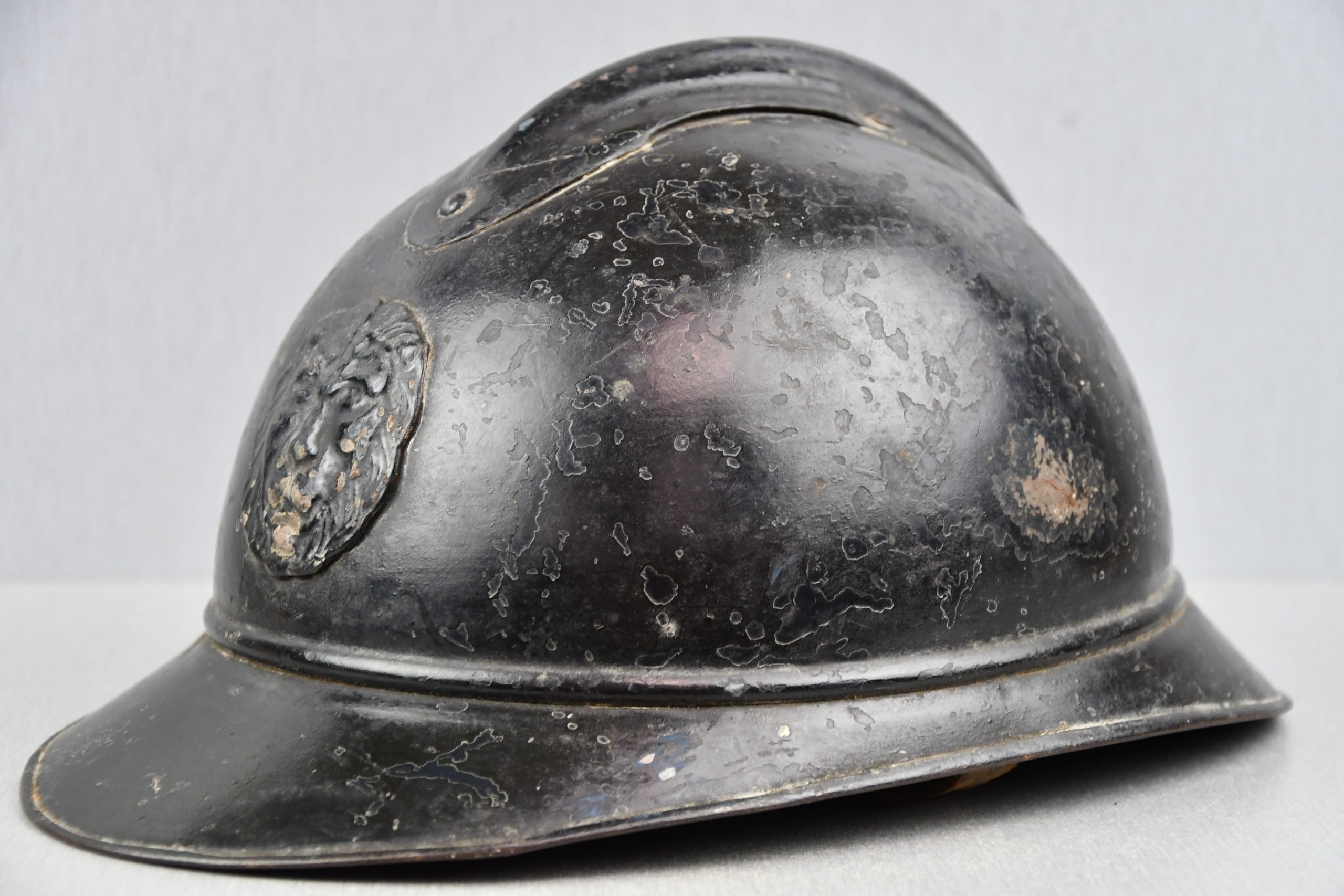Textbook Belgian M1915 Adrian steel helmet, worn during World War One, including use by the Belgian Rijkswacht (Gendarmerie). During WW1, the Rijkswacht was militarised and deployed alongside regular army units, making wartime use of this helmet fully correct. Originally issued in the typical Belgian mustard green paint, this helmet was already worn during WW1 and later continued in service, when it was overpainted black for extended Rijkswacht use in the post-war period. The visible wear and patina clearly reflect long-term service. The helmet is complete with its original leather liner and full-length chin strap. The liner remains intact with all leather tongues present and retains its original tightening cord. The chin strap is original and still attached. Inside the shell, a possible stamped number or marking is visible (Stamnummer?), consistent with Belgian-issued Adrian helmets, though partially difficult to read. A highly attractive and historically interesting example of a WW1-used Belgian M1915 Adrian helmet, showing continuous service from wartime use through Rijkswacht duty.