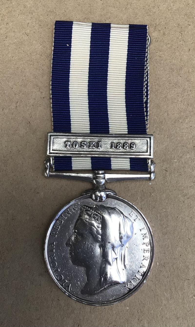 Original full size medal impressed in large Roman capitals '9th Bn INFy No. 1078'.The Battle of Toski (Tushkah) was part of the Mahdist War. It took place on August 3, 1889, in southern Egypt between the Anglo-Egyptian forces and the Mahdist forces of the Sudan.Since 1882, the British had taken control of Egypt and found themselves involved in the Mahdist War. For this reason, they decided to reform and rearm the Egyptian Army. In 1885 a British general, Sir Francis Grenfell was appointed Sirdar (commander-in-chief) and British officers trained and led the newly formed units.The Sudanese, on the other hand had not renounced their ambition of spreading the Mahdist faith to Egypt. In 1889, the Khalifa Abdallahi ibn Muhammad sent the Emir Wad-el-Nujumi and an army 6,000 strong into Egypt for this purpose. The Mahdists avoided Wadi Halfa where most of the Egyptian troops were garrisoned, and camped at Toski by the Nile, 76 km north of the Egypt–Sudan border. Here they were attacked by the Egyptian Army, who nearly annihilated the Sudanese after a five-hour fight. The Emir was killed trying to rally his men with only 800 Mahdist warriors escaping. Apart from the officers commanding the Egyptian units, the only British troops participating were a squadron of the 20th Hussars ( in total 98) and 83rd Foot ( in total 29).