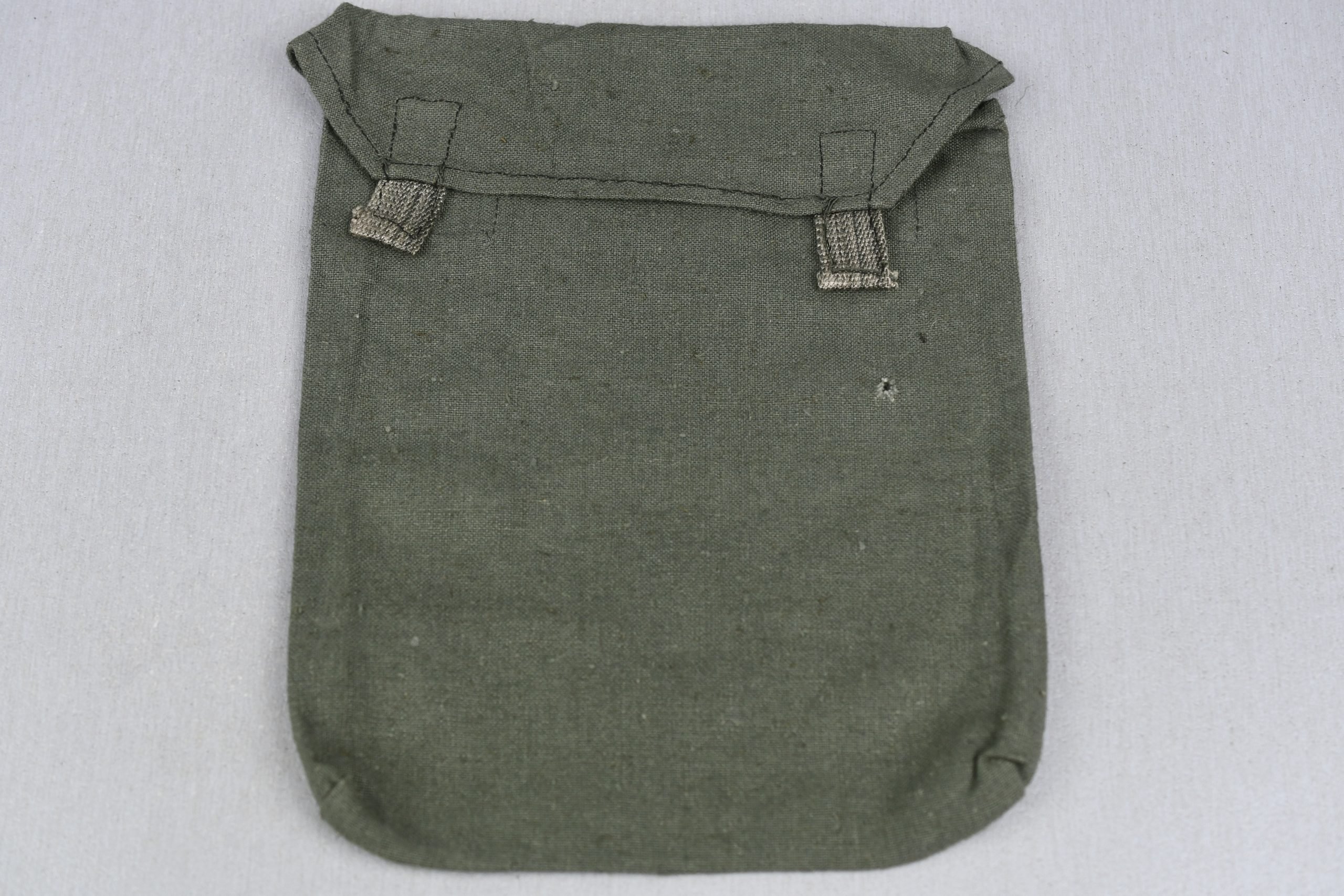 Late-war 'M1945' constructed Wehrmacht gas capepouch in excellent condition. Thin green colored canvas construction. To save on costs in late stages of the war, this example was made without press buttons. Void of markings.