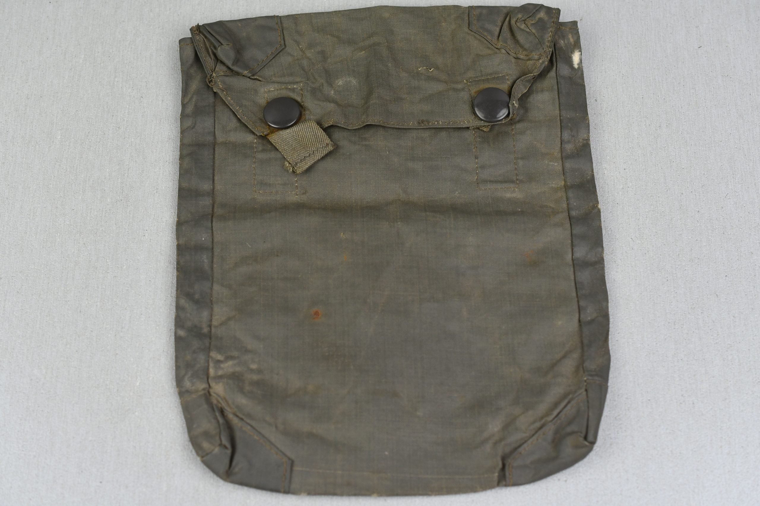 Genuine gas cape pouch. Rubberized material, PRYM marked snap buttons funcitional. Maker marked by 'geb' dated 1941