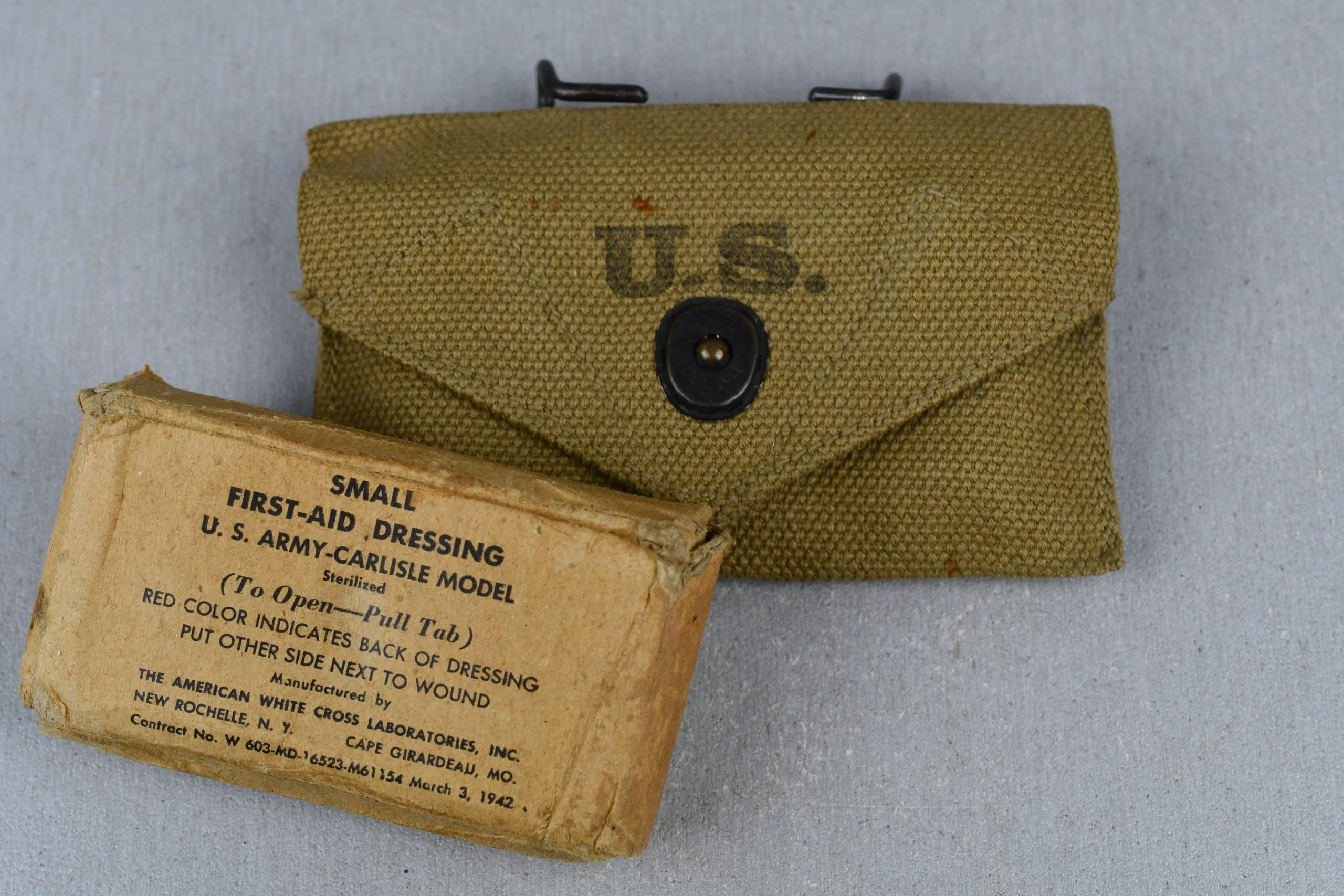 Pouch designed to hold a first aid packet and issued to every GI.This is the early-WW2 M1924 model which is smaller than the later models.Pouch comes with a 1942 dated small first aid dressing as shown.Pouch is clearly marked EA BROWN Manufacturing Company and made in 1942.Pouch is in near mint condition with one small rust stain on the flap but this does not detract!