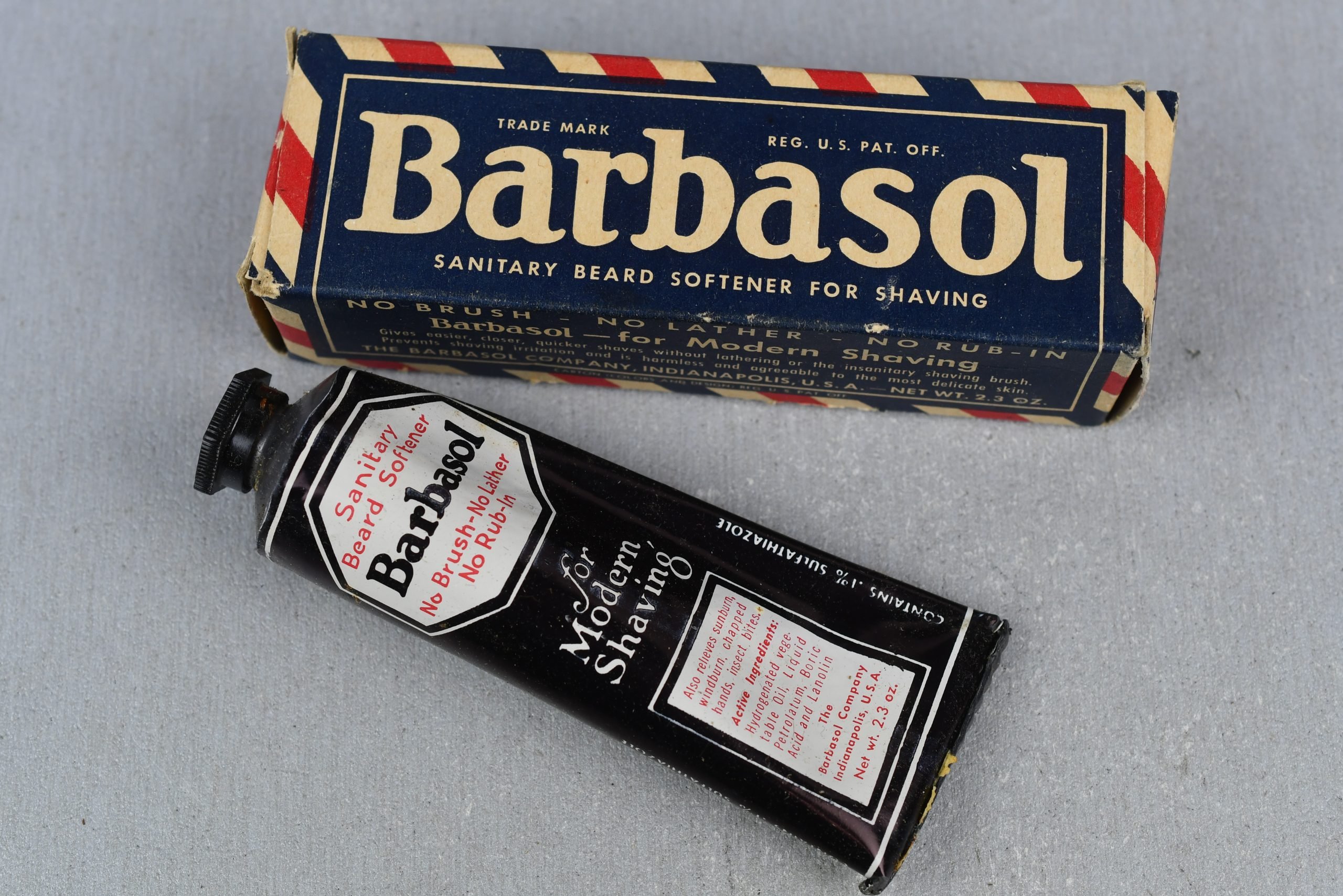 This original Barbasol brushless shaving cream represents one of the most iconic shaving products used by American soldiers during World War II. Barbasol was extremely popular with the U.S. Armed Forces due to its ease of use, hygienic properties and suitability for military life, requiring no shaving brush and minimal water. Such products were standard personal items for American soldiers both in training camps and while deployed overseas.The shaving cream is complete with its original cardboard box and aluminium tube, which is still full and unopened. The box shows only light wear consistent with age, while the overall presentation remains very attractive. This piece makes an excellent addition to a US WWII mannequin, personal equipment display or a collection focused on American military-issued toiletries.