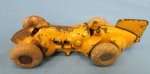 Original period manufacture. Cast iron toy race car with its original rubber wheels and yellow paint finish intact. Measures 4.25 inches in length, scattered paint chipping and surface corrosion as shown. Looks like an early Batmobile.