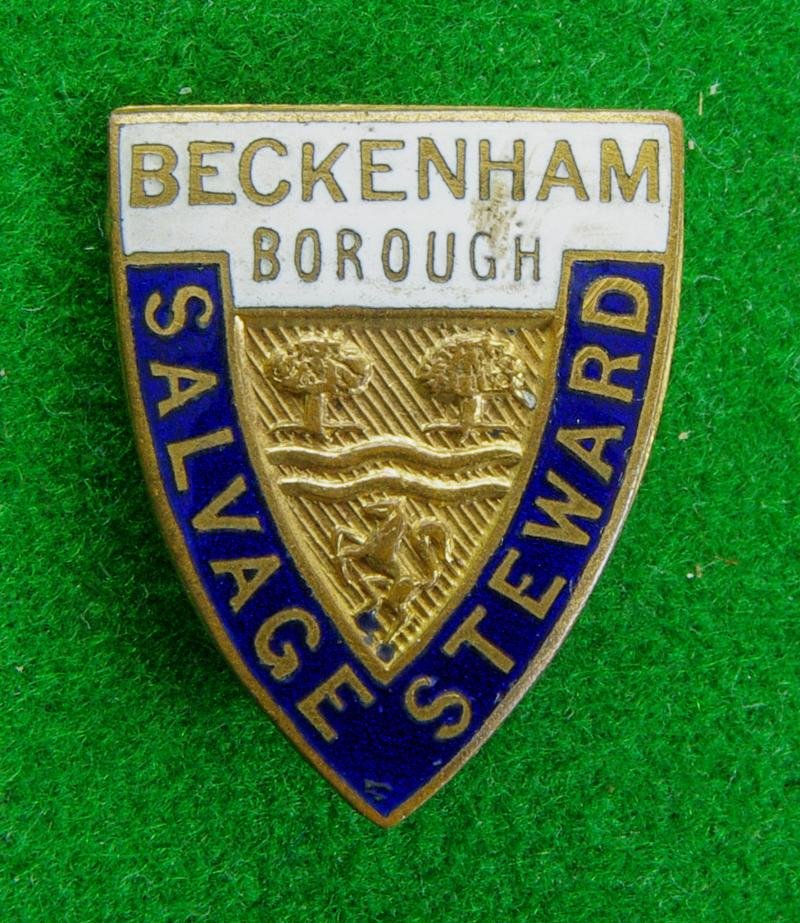 Scarce WW II brass and enamel lapel badge with locking brooch pin fitting and makers detail for Marples & Beasley Birmingham to the reverse. A shield shape bearing the white enamel title, ' Beckenham Borough ' above the Coat of Arms flanked by the blue enamelled titles, ' Salvage Steward'