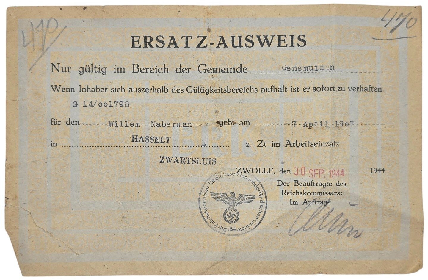 Original WW2 Dutch Document - Ersatz Ausweis Genemuiden, Hasselt, Zwartsluis, Zwolle (1944)